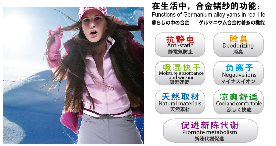 The Germanium alloy yam which designed for clothing when dressers who work in different metabolic environment also feel comfortable.