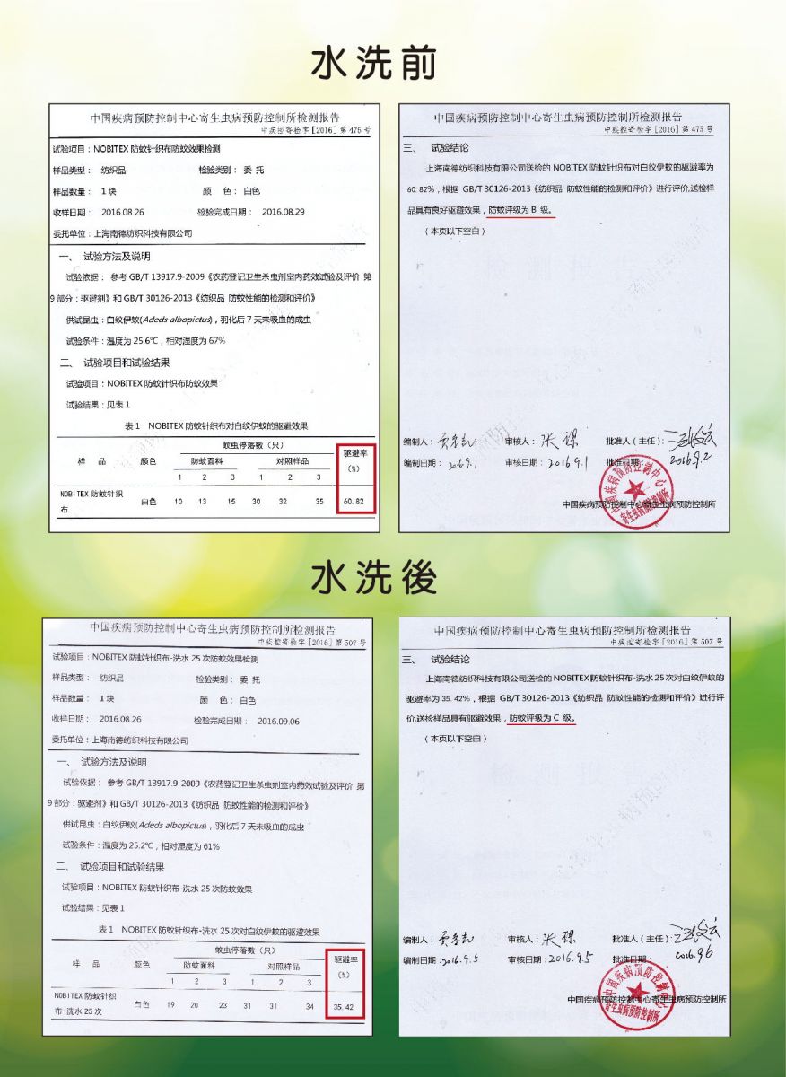 在水洗的情況下,NOBITE奈米原料仍具有驅避蚊蟲的效果。NOBITEX奈米原料所制成的織物在經過大量的摩擦后,仍對蚊蟲有驅避作用。而其它市售防蚊液在經過摩擦后,就失去驅避效果。